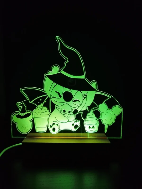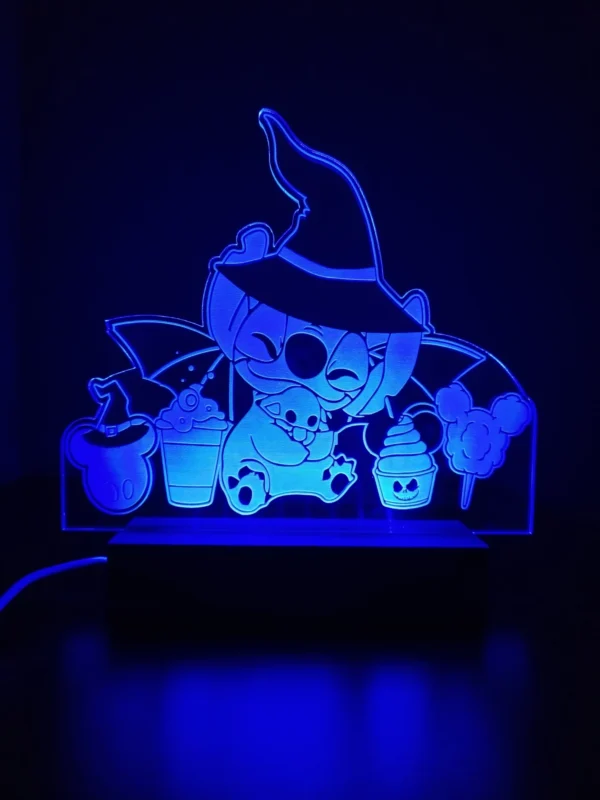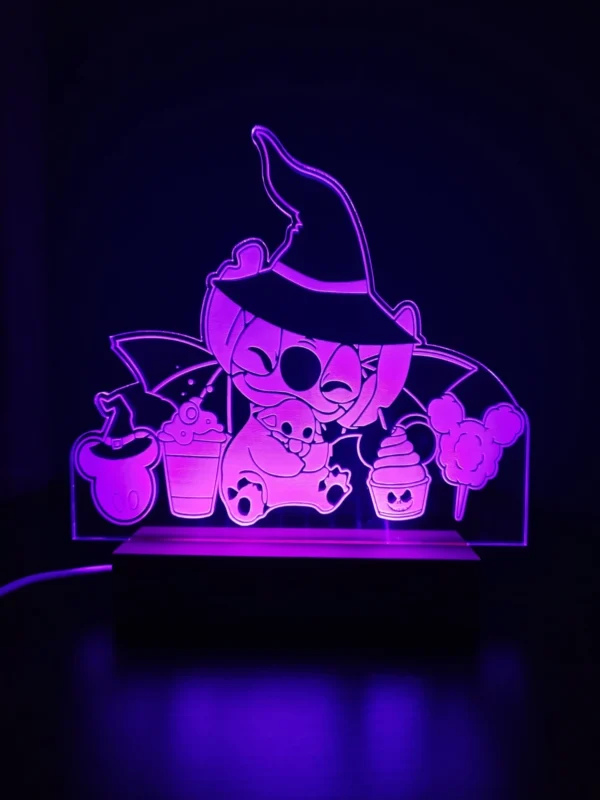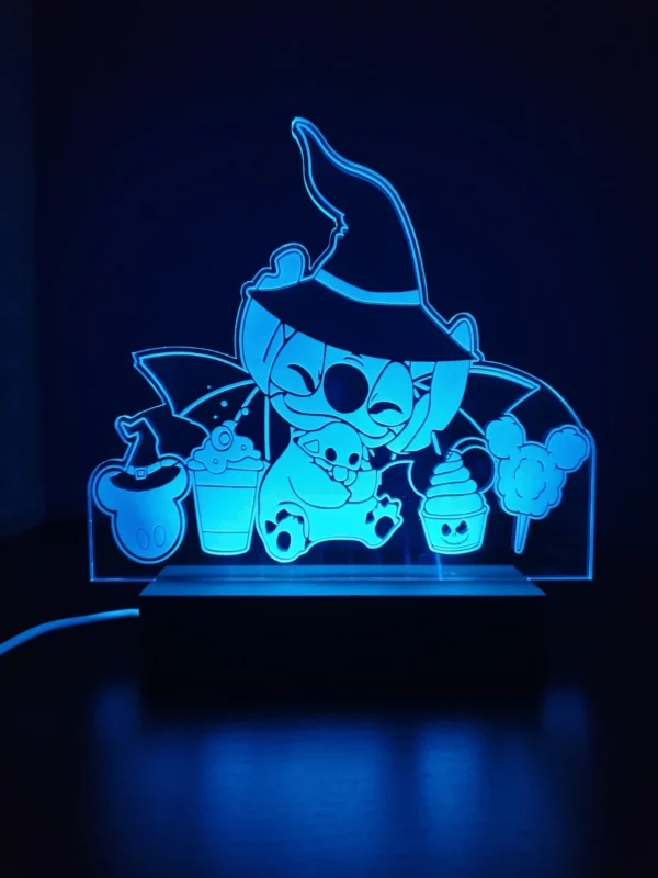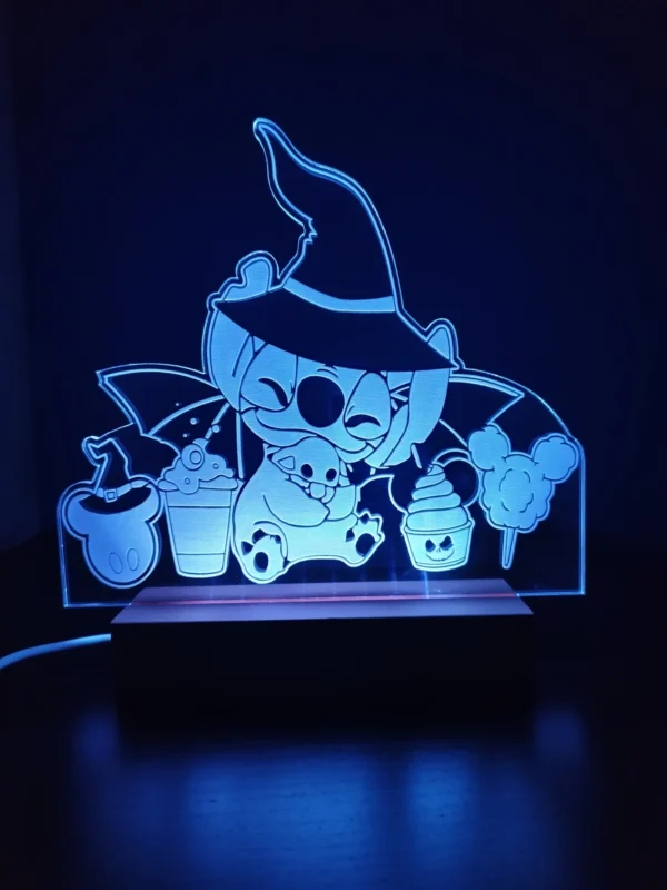 Lampe LED avec base rectangulaire en bois et dessin gravé sur acrylique transparent.